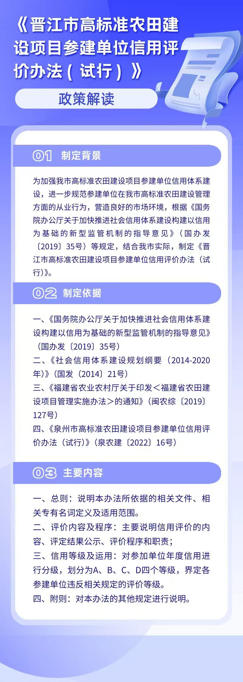 【圖解】晉江市農(nóng)業(yè)農(nóng)村局關(guān)于印發(fā)《晉江市高標(biāo)準(zhǔn)農(nóng)田建設(shè)項目參建單位信用評價辦法(試行)的通知》政策解讀