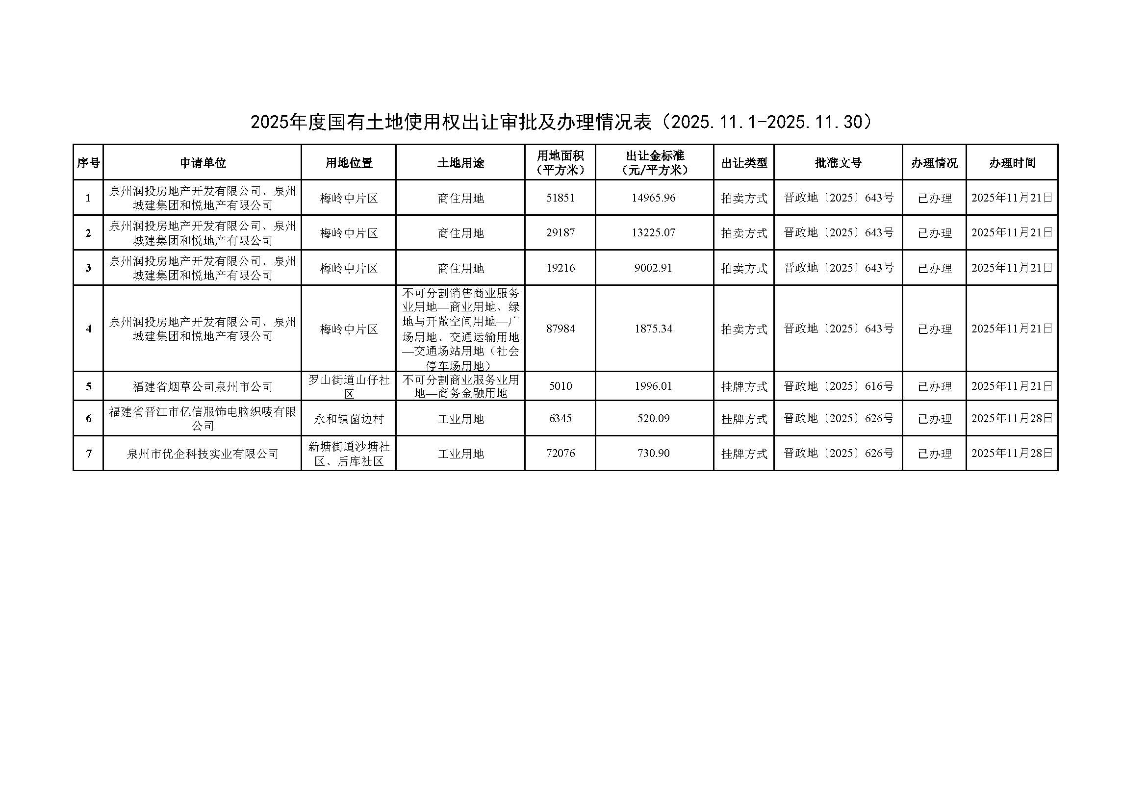 2025年度國有土地使用權出讓審批及辦理情況表(2025.11.1-2025.11.30)