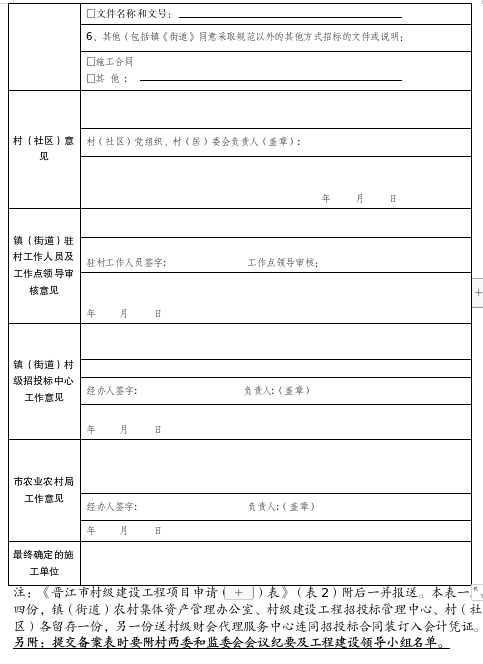 (二)鎮(zhèn)級應(yīng)急救災(zāi)項目,存在復(fù)雜技術(shù)難度或特殊要求、不適宜進(jìn)行公開招標(biāo)的項目,經(jīng)鎮(zhèn)招投標(biāo)中心審查提交鎮(zhèn)黨委(擴(kuò)大)會研究同意后,可采取邀請招標(biāo)或直接指定等方式確定施工方(供貨方);村級應(yīng)急救災(zāi)項目,存在復(fù)雜技術(shù)難度或特殊要求、不適宜進(jìn)行公開招標(biāo)的項目,由村“兩委”集體研究后,填報《晉江市村級應(yīng)急、零星工程項目申請表》(附件6),報鎮(zhèn)駐村干部、包村領(lǐng)導(dǎo)同意簽字后實施(3日內(nèi)完成),并及時將《晉江市村級應(yīng)急、零星工程項目申請表》(附件6)在福建省基層小微權(quán)力監(jiān)督平臺、村務(wù)公開欄公示。
