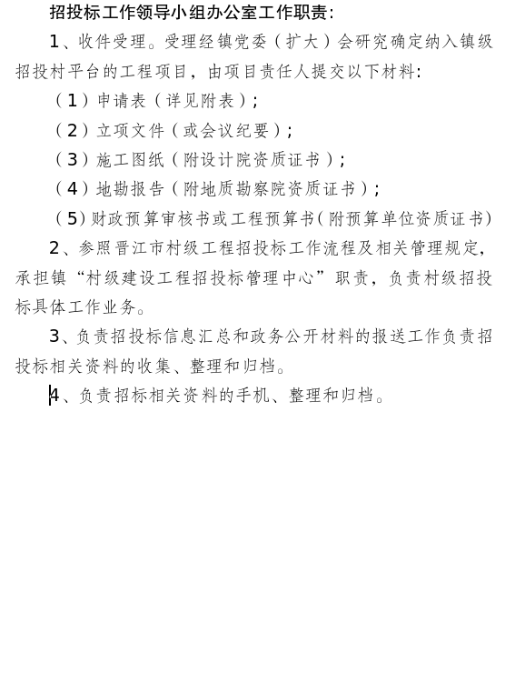 1.統一受理鎮、村建設項目招投標的申請,協助指導項目業主制定招標文書;